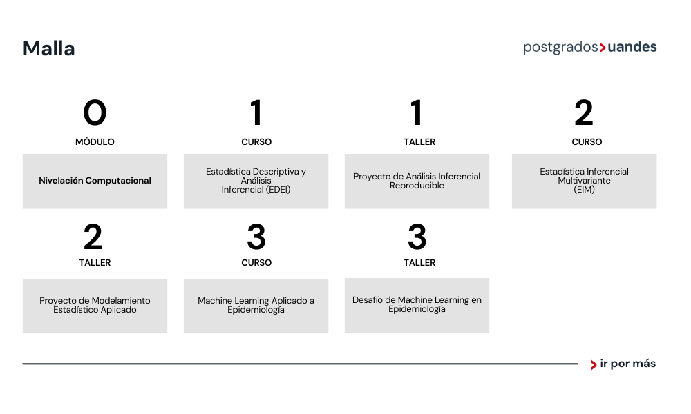 El programa se compone de 4 módulos dictados en forma secuencial y en modalidad semipresencial, incorporando contenidos relacionados con machine learning y big data, orientados a fortalecer competencias aplicadas en epidemiología.