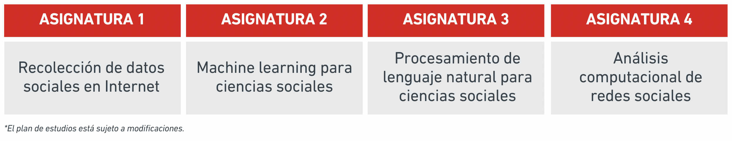Este diplomado está conformado por 4 cursos: Curso Recolección de datos sociales en Internet, Curso Procesamiento de lenguaje natural para ciencias sociales, Curso Análisis computacional de redes sociales y Curso de Machine Learning con Datos Sociales.