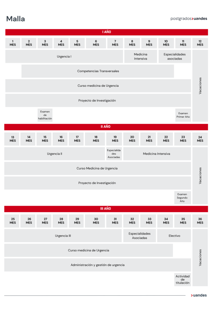 El programa de Especialidad Médica en Medicina de Urgencia se encuentra dividido en tres grandes áreas: