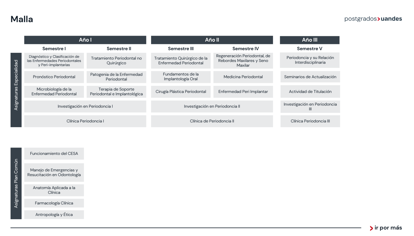 El Programa de Especialización en Periodoncia de la Universidad de los Andes se orienta hacia la enseñanza y el desarrollo de las competencias para realizar Prevención, Diagnóstico, Pronóstico y Tratamiento de las enfermedades que afectan a los tejidos Periodontales y Peri implantarios. Especial preocupación en la formación de nuestros estudiantes se establece en desarrollar las competencias clínico-quirúrgicas de los estudiantes, lo que constituye un rasgo diferenciador de nuestro programa.