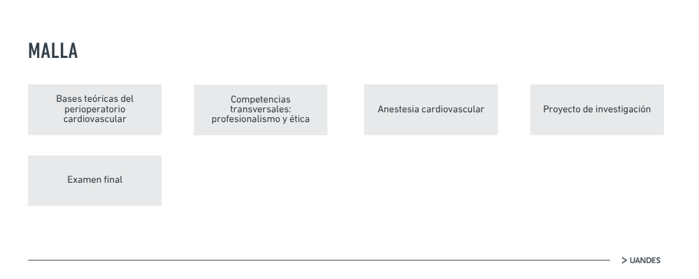 El programa de Anestesia Cardiovascular consta de módulos temáticos teóricos en paralelo a la práctica continua al lado del paciente, con una duración de un año.El fellow en Anestesia Cardiovascular de la Universidad de los Andes será capaz de ejercer como Anestesiólogo Cardiovascular en servicios de Cirugía Cardíaca, Pabellones de Cardiología Intervencional y electrofisiología, como también en unidad de cuidados intensivos cardiovascular tanto del sector público como privado, continuando su formación permanente, ya sea en el campo profesional o integrándose al ámbito académico y de la investigación.