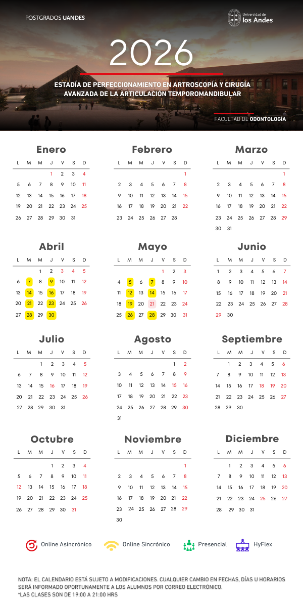 El Programa Estadía de Perfeccionamiento en Artroscopía y Cirugía Avanzada de la Articulación Temporomandibular de formación teórico-práctico de extensión semestral, con un enfoque integral centrado en capacitar al profesional especializado en cirugía maxilofacial y entregar herramientas para un correcto diagnóstico de la patología funcional de la ATM, de manera de que pueda integrar diferentes conocimientos en esta área y así formar un criterio para la resolución de problemas a través de la indicación del procedimiento. Al mismo tiempo considera una formación teórico-práctica en los distintos niveles de artroscopía de ATM, así como en la resolución de sus complicaciones más frecuentes.